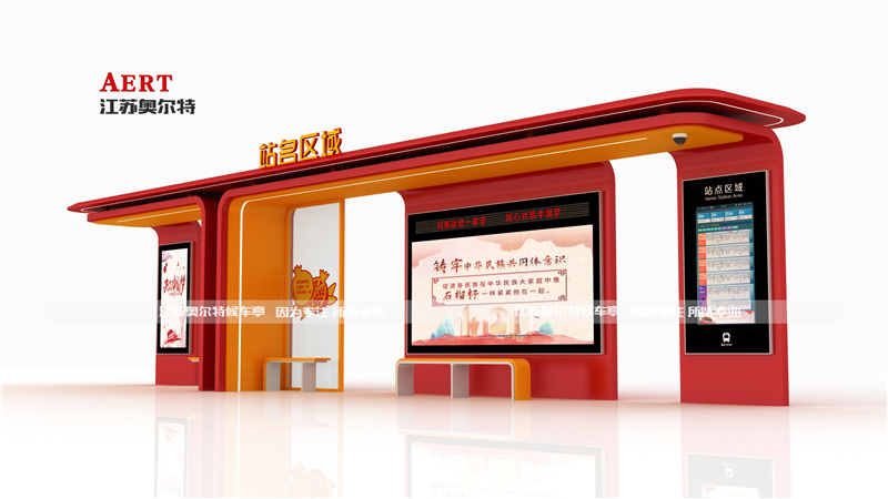 這是一款融入紅色文化元素的智(zhì)慧公交車站台,由(yóu)江蘇奧爾(ěr)特候車亭廠家設計、生產,整體(tǐ)以紅色和橙色為(wéi)主(zhǔ)色調,帶有“站名區域”等標識,還配備了(le)電子顯示屏,能(néng)展示公交信息和紅色文化相關內容,把智慧功能和文化宣傳結合在了一(yī)起。